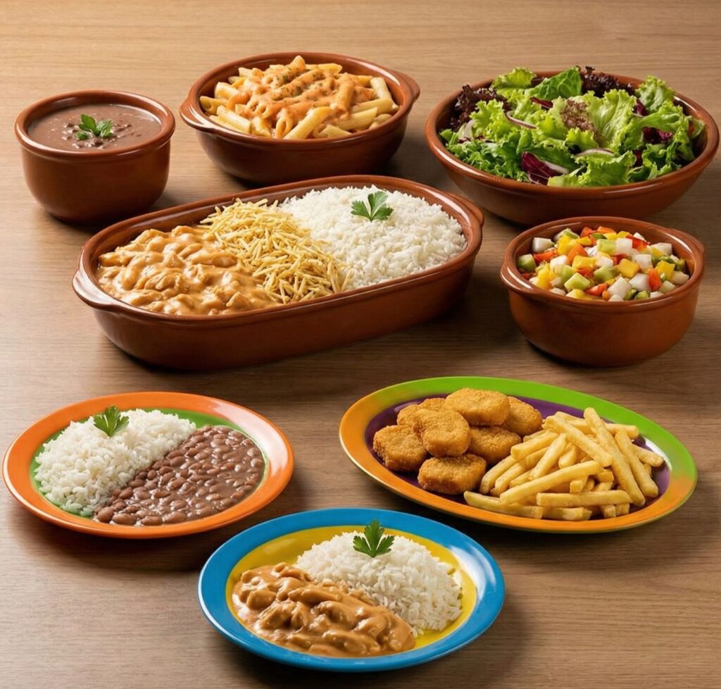 Refeições Infantis: Arroz, feijão, nugetts, batatas fritas, estrogonofe de frango e carne moida