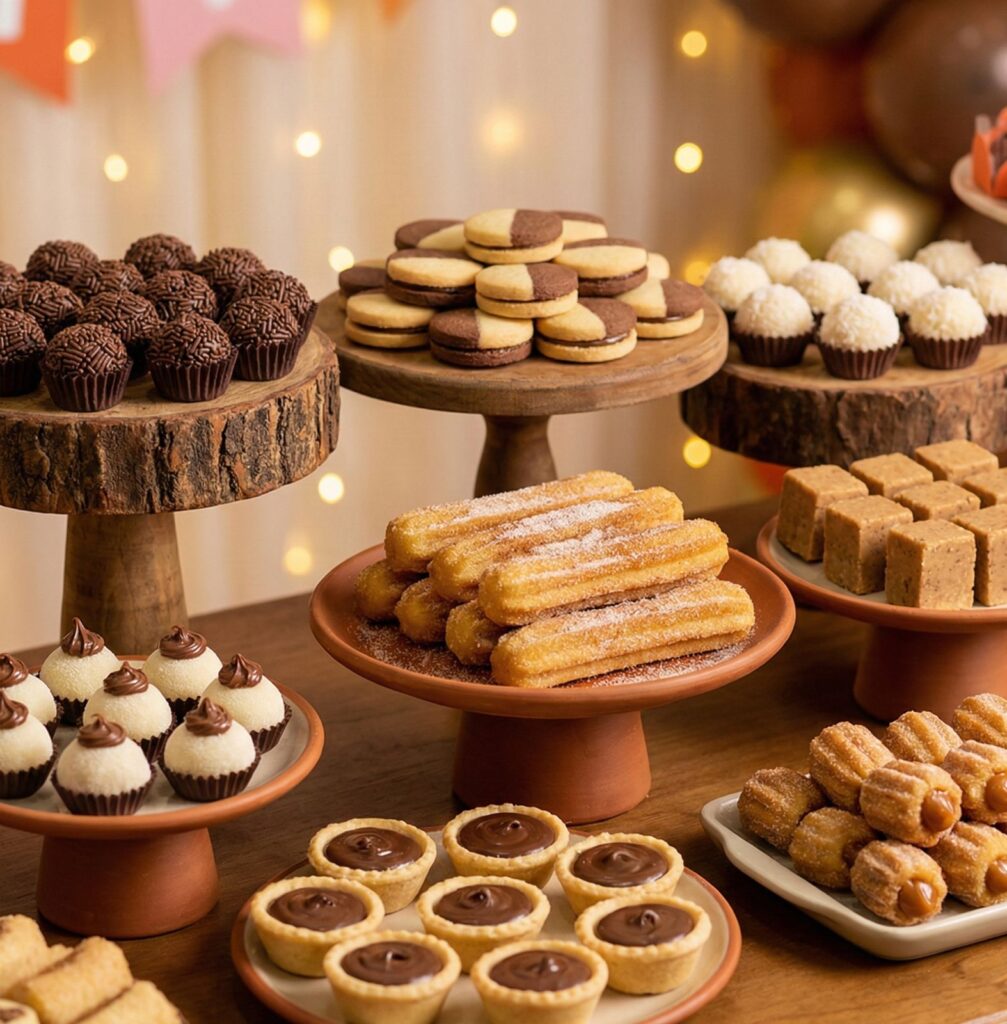 Brigadeiro, casadinho, beijinho de coco, churros, paçoca, ninho c/ nutella, empadinha de Chocolate, Mini churros de doce de leite.